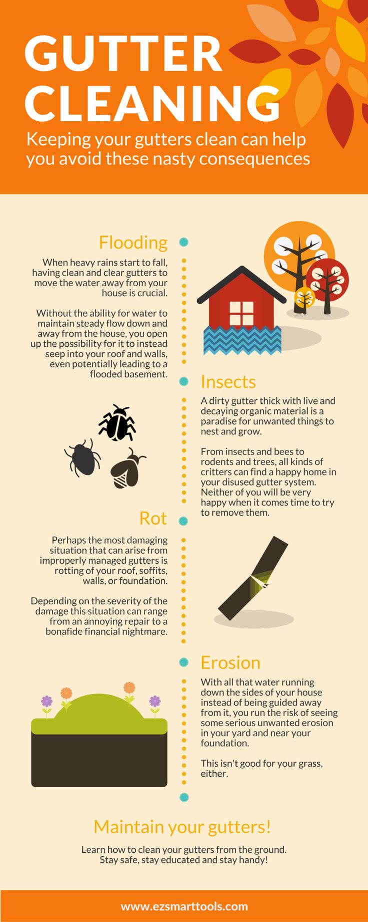 Infographic titled “Gutter Cleaning” with illustrations and text detailing the consequences of not keeping gutters clean: flooding, insects, rot, and erosion. Icons and brief descriptions are provided for each issue. Ends with advice to stay safe, educated, and handy.